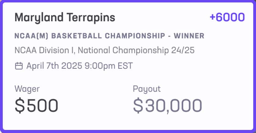 Florida sports betting is only legal on Hard Rock Bet, so it shouldn’t come as a surprise that we’ve got a couple of potentially gainful Florida tickets. This bettor threw down $250 on UF at +6000 back in early November and I don’t think even they would have believed that a thirty-win season was in the cards. Florida finished the year 30-4, winning their conference tournament after topping a historically competitive field. Florida are the #1 seed in the West Regional and are the second-favorite two win it all at +400 on Hard Rock Bet.