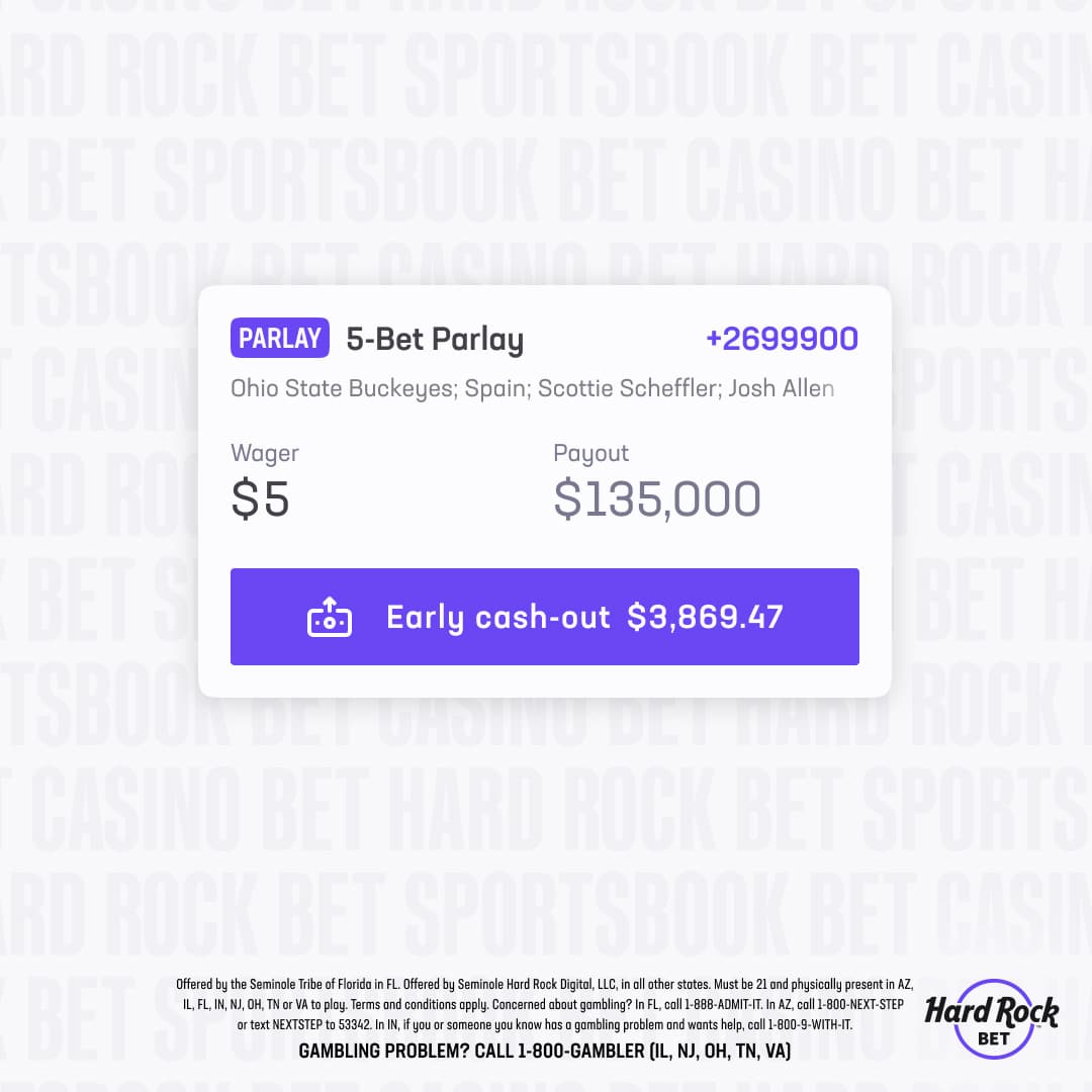 Offered by the Seminole Tribe of Florida in FL. Offered by Seminole Hard Rock Digital, LLC, in all other states. Must be 21+ and physically present in AZ, CO, FL, IL, IN, NJ, OH, TN or VA to play. Terms and conditions apply. Concerned about gambling? In FL, call 1-833-PLAYWISE. In IN, if you or someone you know has a gambling problem and wants help, call 1-800-9-WITH-IT. GAMBLING PROBLEM? CALL 1‑800‑GAMBLER (AZ, CO, IL, NJ, OH, TN, VA)