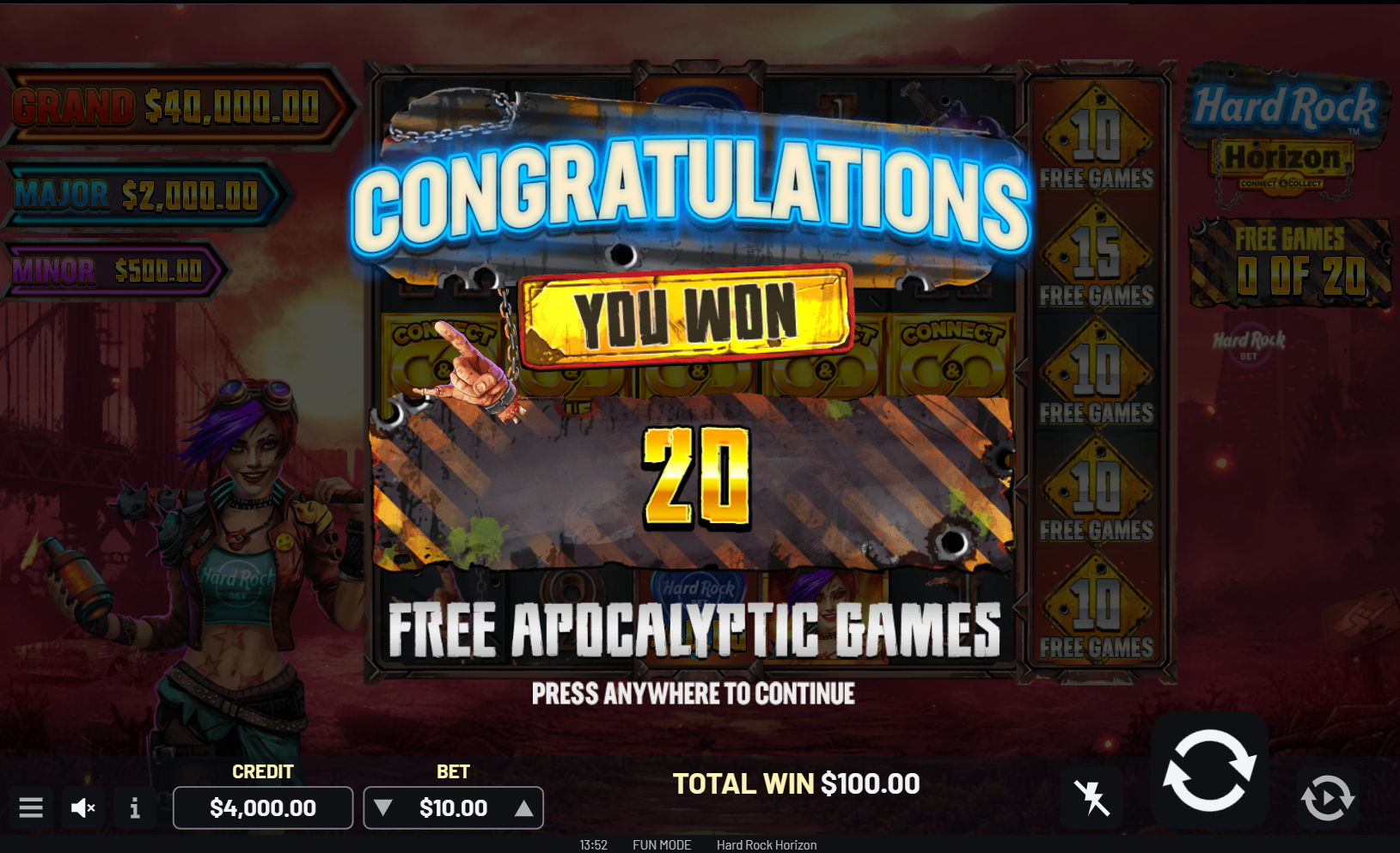 The Connect and Collect feature turns every spin into a high stakes chase, linking symbols together for explosive rewards and the chance to trigger free apocalyptic games. From massive multipliers to the thrill of hitting a grand prize, Hard Rock Horizons keeps the action loud and the wins louder. When the dust settles, one thing is for sure, this game does not just play, it rocks. Similar to Hard Rock Horror show, you can also skip the wait and there are a few bonus buy slot features to jump right to the bonus round.